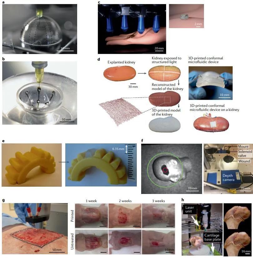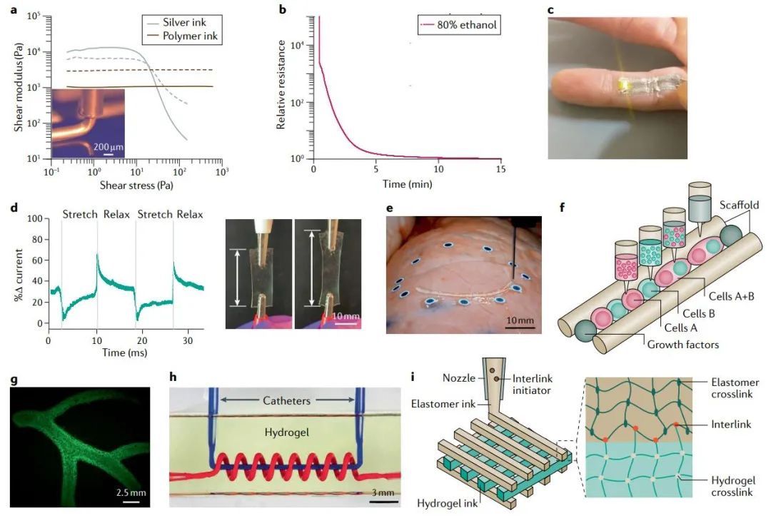 水凝胶可用于组织工程和生物电子应用,其类似于天然细胞外基质,可为细胞提供合适的培养环境。通过改变水凝胶聚合物网络的孔隙率和粘度可对其强度和粘弹性进行调节,通过添加光引发剂及流变改性剂可对其打印性进行优化。水凝胶可以在组织表面进行原位3D打印制造,从而用于医疗密封剂、粘合剂植入物和可穿戴设备等方面。