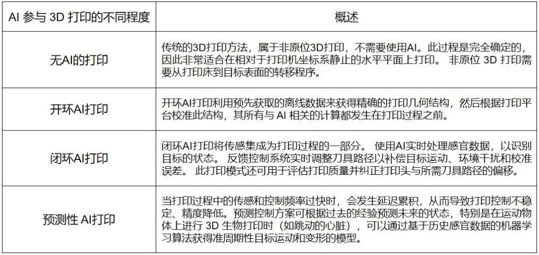 除了没有AI的传统3D打印系统之外,根据AI参与打印程序的三个级别可将打印分为:开环AI、闭环AI和预测性AI三种。
