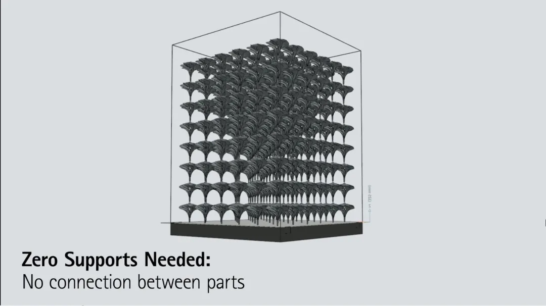 结合 EOS 用于优化热量管理的专有Smart Fusion (智能融合技术)技术,一项作业可以完全 "自由浮动 "在成型仓中进行打印,无需任何支撑。比如,我们选择了“微型叶轮”作为理想的参考几何体,因为它在打印过程中的应力相对较小,是一个完美的展示品。它不仅可以像陀螺一样旋转,增加了趣味性,而且这些改进的工作原理可以应用于各种几何形状和应用,前提是部件可以从 X/Y 平面上相对较小的部分开始定向。