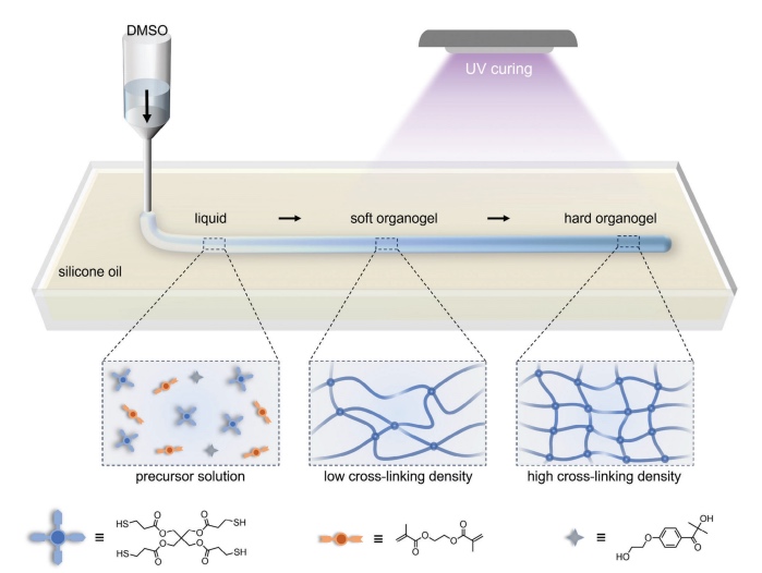 (3)使用3D打印的液体通道作为模板,可以制备具有均匀或梯度交联密度的纤维状有机凝胶,为制备具有可调机械强度的软材料提供了新方法。