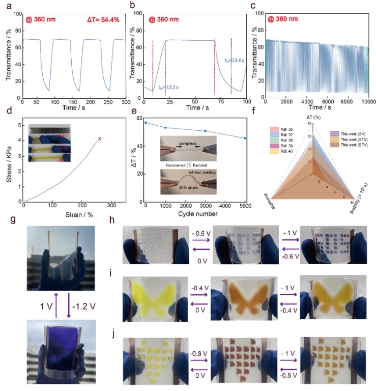 3D打印一体化水凝胶基FECDs具有良好的电致变色性能和机械性能,包括高光学对比度(360 nm处最大为54.4%),优异的循环稳定性(10,000 s后对比度保持率大于95%),且5,000次弯曲循环后光学对比度保持率大于80%。基于一体化3D打印技术,集成制造了10×10 cm2的水凝胶基FECDs智能窗户以及不同心型和SOS阵列。
