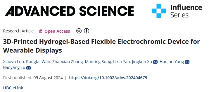 Xiaoyu Luo#, Rongtai Wan#, Zhaoxian Zhang#, Manting Song, Lixia Yan, Jingkun Xu*, Hanjun Yang* and Baoyang Lu*, 3D-Printed Hydrogel-Based Flexible Electrochromic Device for Wearable Displays. Advanced Science, 2024, 2404679.
