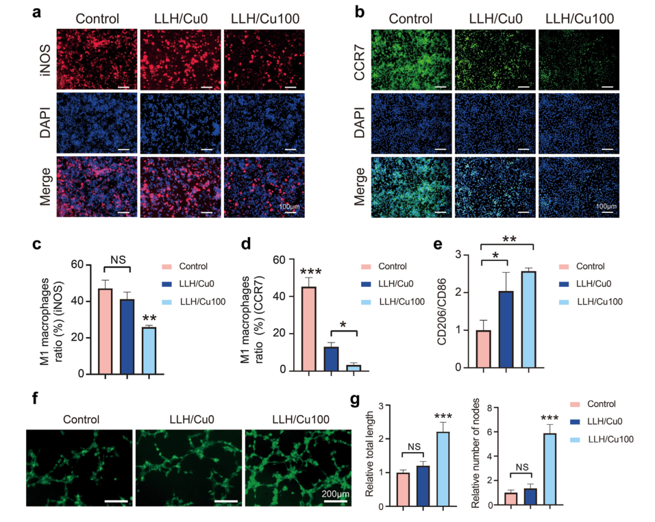巨噬细胞在伤口愈合过程中起着至关重要的作用,在伤口愈合的后期,M1 型巨噬细胞占主导地位,可导致慢性炎症、伤口愈合延迟或疤痕形成增多。为了确定DLS中Cu-EGCG的最佳比例,将Cu-EGCG分别以0、25、50、100、200 μg/mL (LLH/Cu0、LLH/ Cu25、LLH/Cu50、LLH/Cu100、LLH/Cu200)的浓度加入GelMA/HAMA中。与对照组 (47.16 ± 4.5%) 和 LLH/Cu0 组 (41.30 ± 3.2%) 相比,LLH/Cu100 组 (25.91 ± 1.0%) 中的 M1 巨噬细胞 (iNOS+) 显著减少。这些发现共同表明 DLS具备优异的体内抗炎抗菌潜力。
