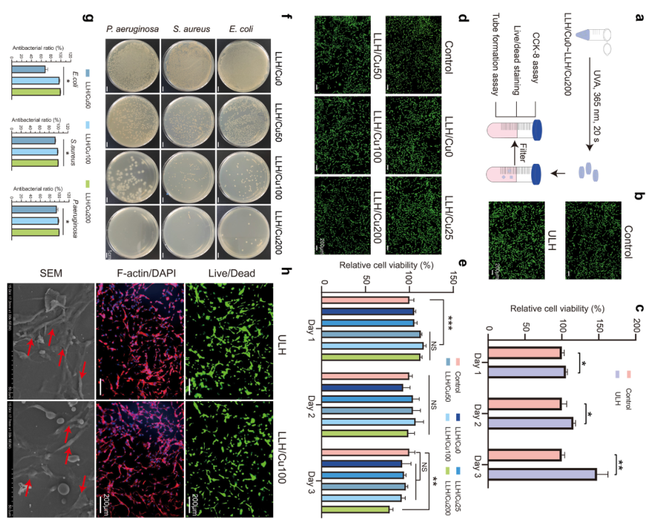 大肠杆菌、金黄色葡萄球菌和铜绿假单胞菌引起的伤口感染在烧伤患者中很常见,这显著增加了死亡率,需要紧急医疗干预。为了对抗感染,铜-表没食子儿茶素没食子酸酯 (Cu-EGCG) 被加入到下层生物墨水中,为探究Cu-EGCG的体外抗菌特性,对上述菌株进行了固体琼脂平板检测。体外实验表明,加入50μg/mL Cu-EGCG显著降低了三种菌株的菌落形成单位(CFU)。