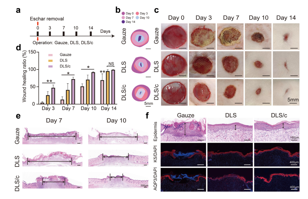 为了进一步评估 DLS 的安全性和治疗效果,研究人员使用烧伤感染性 SD 大鼠进行了探索。在第 3 天,DLS(38.24±8.06%)显示出比纱布(3.07±3.36%)更大的愈合面积,并表现出加速的愈合动力学。此外,DLS组显示出与正常皮肤相似的真皮厚度,进一步证实了 DLS 可以加速感染性烧伤伤口的愈合过程,并在重塑阶段促进真皮和表皮的有效再生。