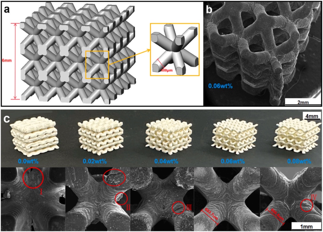 北京理工大学李营团队研究了一种新型的柔性压电陶瓷复合材料 (FPCCs),旨在解决 FPCCs 制备精度低和难以同时提升压电性能和柔韧性的问题。首先通过配置柔性树脂基体和采用表面功能化处理压电陶瓷颗粒,实现了 FPCCs 柔韧性和压电性能的协同提升。其次,团队利用nanoArch® S140(精度:10 μm)制备了体心立方(BCC)结构,添加了不影响压电性能的光吸收剂 TiO2,显著提高了3D打印精度。最终制备的 FPCCs 具有高精度、高柔韧性和良好的压电性能,为 FPCCs 的多功能应用拓展了新的研究方向。