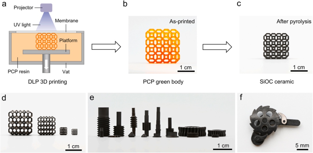 南方科技大学葛锜/王荣团队开发了一种具有超高打印精度和高陶瓷产率的PCP前驱体,采用摩方精密nanoArch® S130(精度:2 μm)和microArch® S240(精度:10 μm)3D打印设备,制备了尺寸从亚毫米到厘米的多种复杂三维结构,打印精度高达5μm。PCP前驱体在1100℃真空热解后转化为SiOC陶瓷,陶瓷产率高达56.9%。