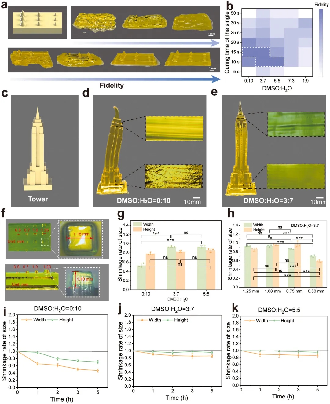 hydrogels”,由于灵活的结构设计和快速原型制造,具有固体和流体特性的3D打印水凝胶已成为生物医学工程,软机器人和柔性电子产品的有前途的候选者。然而,现有的水凝胶3D打印技术由于水蒸发引起的形状变形和坍塌,严重限制了水凝胶复合结构的高保真度。为了解决以上问题,本文提出了一种混合溶剂打印策略,然后进行水透析,通过抑制水蒸发来实现高保真水凝胶结构的还原光聚合3D打印。具体而言,将二甲基亚砜(DMSO)作为助溶剂引入水凝胶油墨中,以提高3D打印过程中的抗脱水性能。然后通过溶剂交换和水透析将制备的凝胶转化为保真度高、性能优良的水凝胶。在这些特性的支持下,各种具有复杂结构的功能器件通过目前各种水凝胶的高保真3D打印进行了演示。溶剂辅助高保真水凝胶3D打印方案结合了对各种高性能水凝胶的兼容性,被认为是可穿戴设备,伤口敷料,电子皮肤和智能机器人的前景广阔。