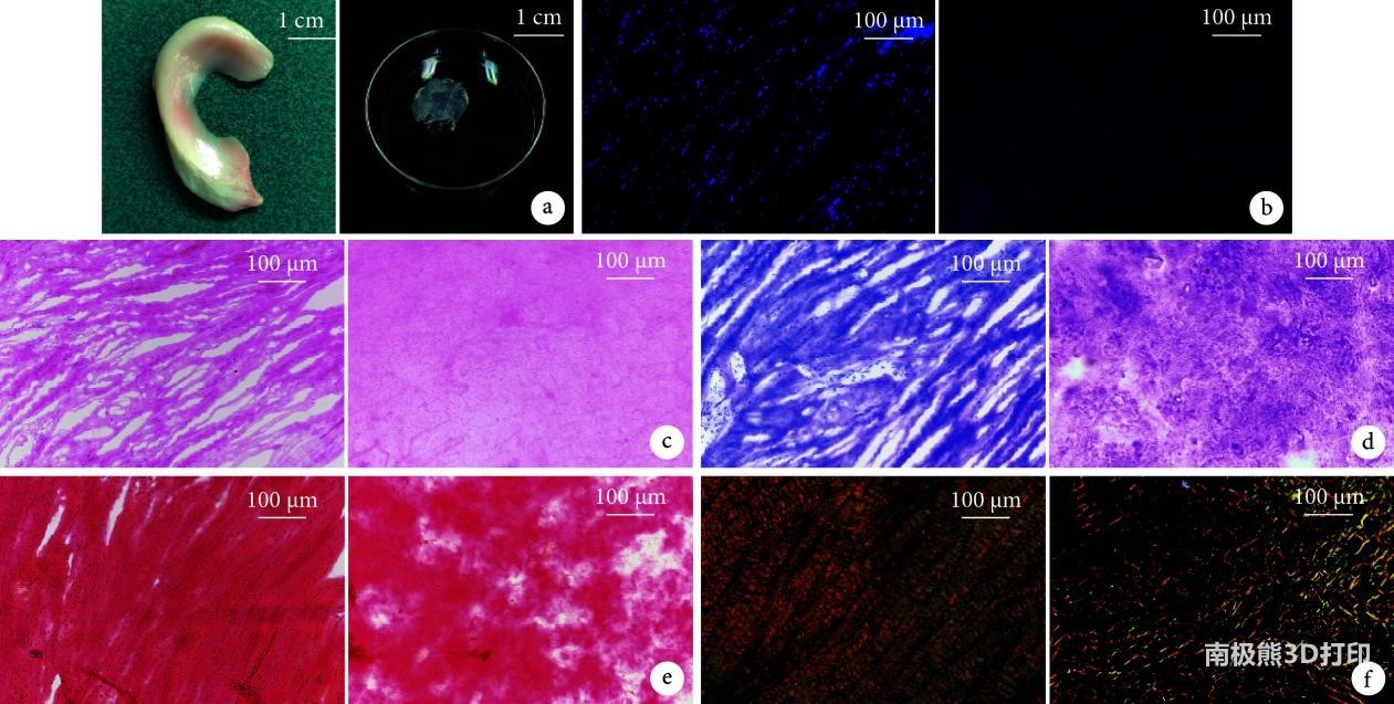 取新鲜猪膝关节半月板,采用改良物理化学联合方法脱细胞处理,获得脱细胞半月板基质匀浆;经大体观察、HE及DAPI染色观察脱细胞效果,甲苯胺蓝、番红O及天狼猩红染色评估黏多糖和胶原保留情况。然后制备脱细胞半月板基质生物墨水,通过低温沉积3D打印技术制备新型组织工程半月板支架。扫描电镜观察微观结构;与脂肪来源干细胞共培养后,采用细胞计数试剂盒8(cell