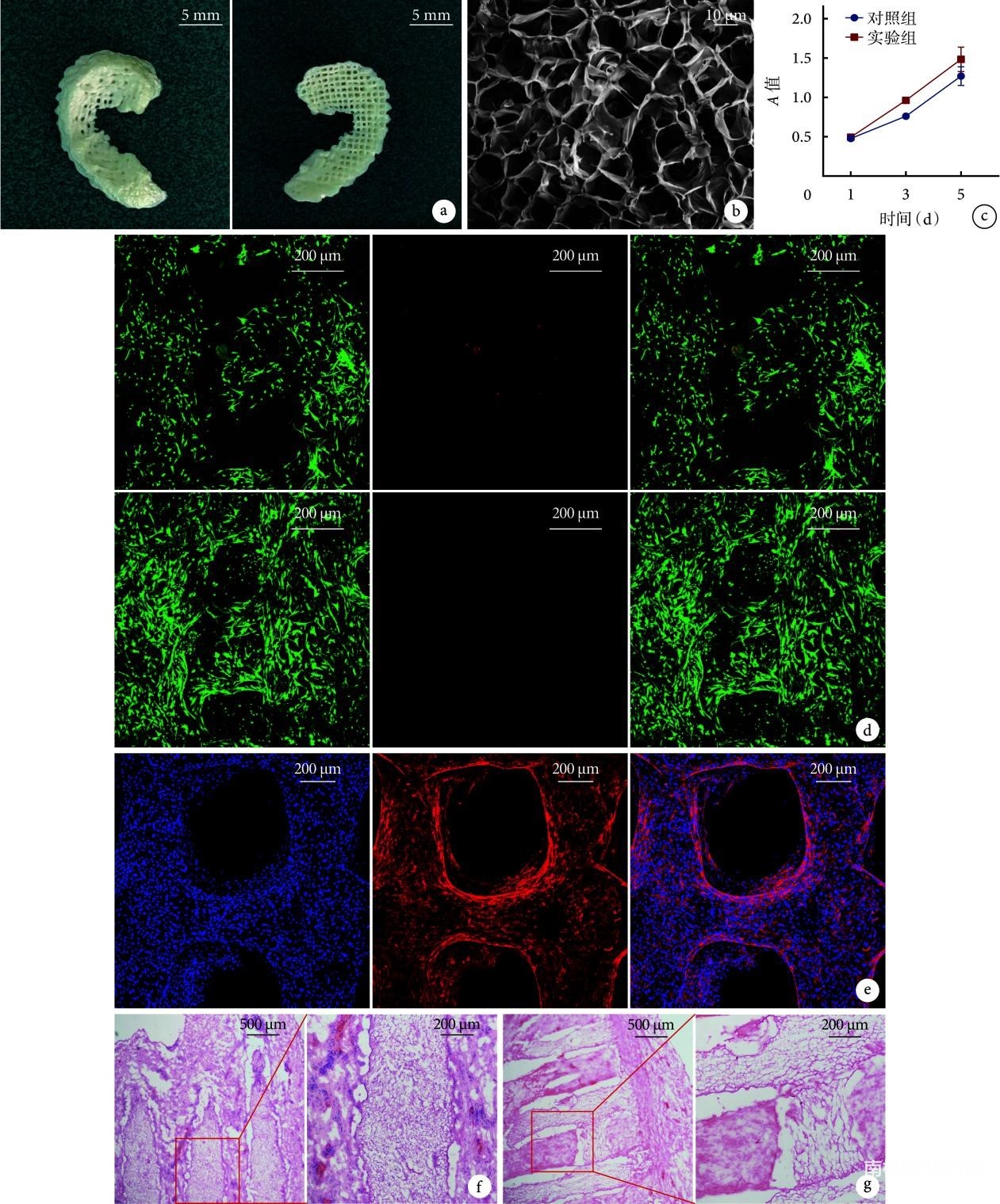 CCK-8检测示两组A值均随时间延长而增加,其中培养3、5天时实验组A值大于对照组,差异有统计学意义(P<0.05)(图2c)。死/活细胞染色示,支架上细胞以活细胞为主,细胞活性达90