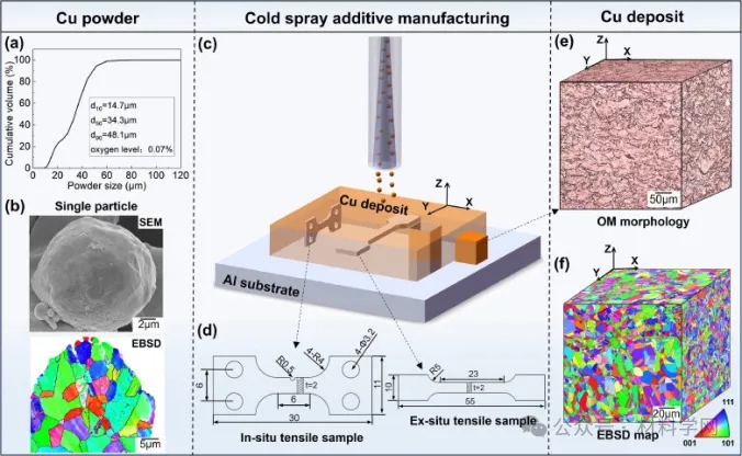 用于CSAM的原始铜粉和由此产生的铜沉积物的微观结构。(a)粒度分布;(b)单个Cu颗粒横截面的SEM形貌和晶粒取向;(c)CSAM沉积和采样位置;(d)原位EBSD预缺口和异位无缺口拉伸测试样品的尺寸;(e)典型铜矿床的3DOM微观结构和(f)3DEBSDIPF图