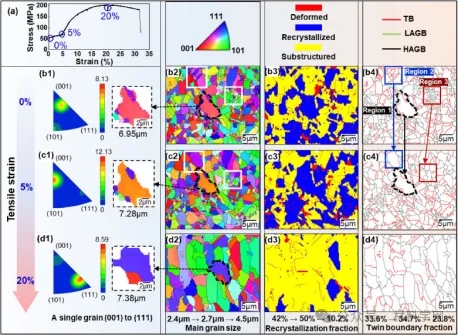铜沉积物原位拉伸试验过程中的EBSD分析(N2,800℃-5MPa)。(a)应力-应变曲线;(b1-d1)取自(b2-d2)的单个颗粒在伸长率分别为0%、5%和20%下的IPF图;(b3-d3)铜矿床分别在0%、5%和20%伸长率下的再结晶图;(b4-d4)伸长率分别为0%、5%和20%时的孪晶边界分布。