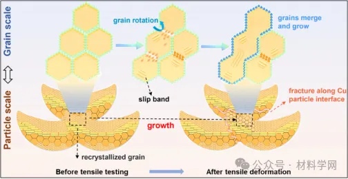 图4 Cu沉积物拉伸试验过程中颗粒变形的延展性机制,显示颗粒变形,晶粒合并和长大。