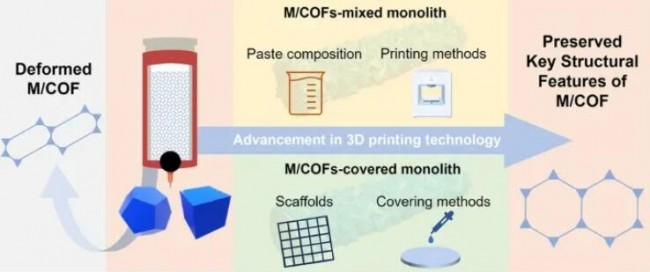 金属有机框架(MOF)和共价有机框架(COF)是由各个模块单元周期性连接形成的独特多孔材料。由于MOF和COF(M/COFs)可以通过调整构建单元来精确定制框架和功能,包括可调节的孔径、丰富的孔体积和巨大的功能化可变性,使得其在气体存储/分离、传感、液体处理、发光、能量存储/转换和生物医学等各个领域得到了广泛的应用。然而,阻碍M/COF进一步商业化的主要限制之一是材料常为粉末状态,这给运输、集成和回收带来了挑战。为解决上述技术问题并推进工业化,3D打印M/COF整体材料技术被认为是最有前途的方法之一,可用于开发下一代功能材料。