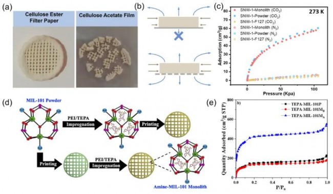 ▲图5. a使用不同干燥基材的无粘合剂3D打印COF的外观;b多孔和无孔基材上3D打印整体材料的干燥机制示意图;c SNW-1整体材料、SNW-1粉末和SNW-1/F127整体材料在273 K下的CO₂和N₂吸附曲线;d浸渍前后的MIL-101整体材料的形成过程;e TEPA-MIL-101粉末、预渗透MOF的3D整体材料、以及经过后处理的3D整体材料的N₂物理吸附等温线