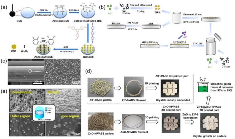 ▲图7. a 3D打印COOH修饰的纳米碳电极上的COF结构示意图;b在Ti₆AlV₄板材上制备ZIF 8和ZIF 8-Ag涂层;c SEM观察涂有ZnO的ABS滤光片;d用于FDM 3D打印的ZIF-8和ZnO-NP复合纤维丝的制备示意图;e 3D打印水凝胶样品的SEM图像。