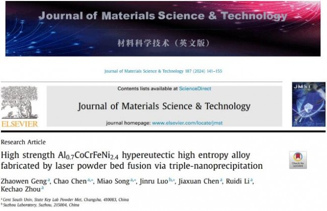 Zhaowen Geng, Chao Chen, Miao Song, Jinru Luo, Jiaxuan Chen, Ruidi Li, Kechao Zhou, High strength Al0.7CoCrFeNi2.4 hypereutectic high entropy alloy fabricated by laser powder bed fusion via triple-nanoprecipitation, J. Mater. Sci. Technol. 187 (2024) 141-155.