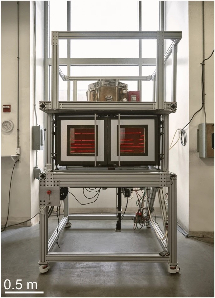 △G3DP3的当前配置:玻璃门后面是构建室,上方是炉窑和坩埚