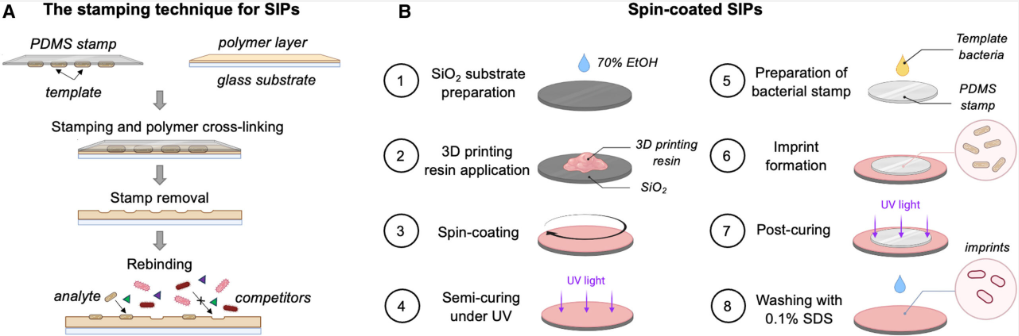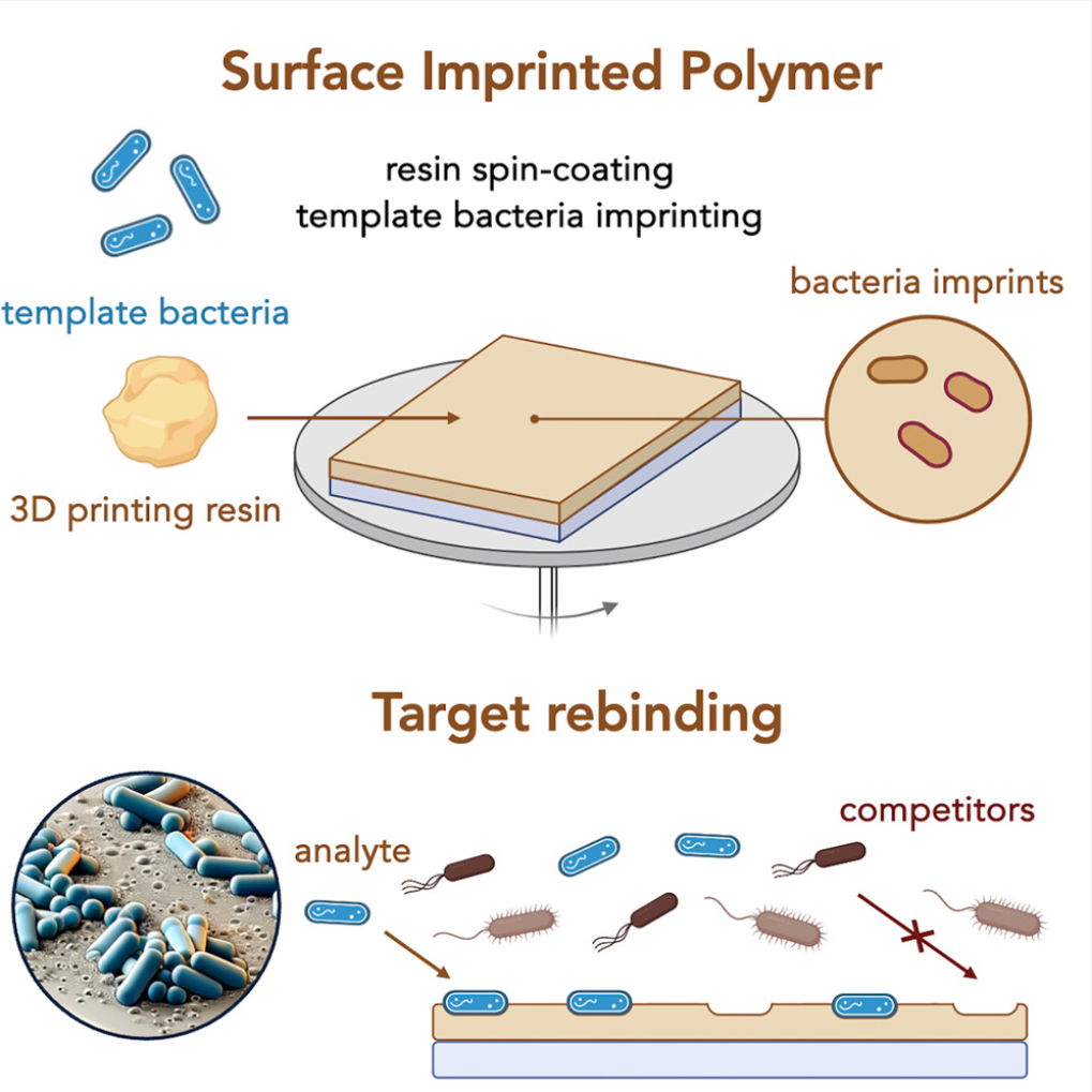 ● 表面印迹聚合物(SIPs):这种材料表面具有与特定细菌形状匹配的微型模具,从而能够捕捉并检测这些细菌。日本冲绳科学技术研究院的研究人员利用3D打印技术制造这些聚合物并整合到传感器或设备中,用于检测食品或水中的有害细菌。
