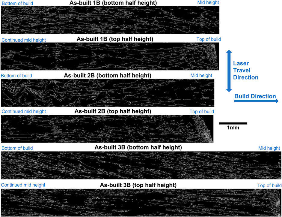 图 3.沿构建方向的 10° 晶界图(不包括孪晶界)。这些图捕捉了制备好的横截面中每个样品的整个高度。为了更好地进行可视化,这些图被分为两个区域(下半部分和上半部分)。