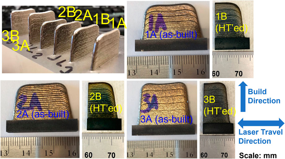 图1. 成品和热处理后的 IN718/R41 级单道薄壁样品。激光行进方向可通过样品表面与构建板平行的线轮廓看出。