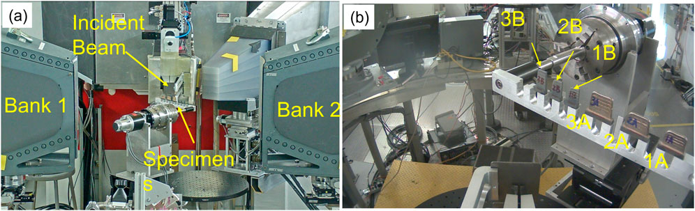 图2. (A)中子衍射实验装置;(B)安装在样品架上的三个成品样品 1A、2A 和 3A 以及三个热处理半件 1B、2B 和 3B 的近视图。