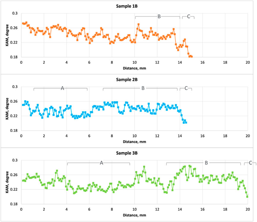 图 6. 沿构建方向(与每张地图的构建板侧的距离)对已构建样品的平均 KAM 值。对图 5中所示的每个薄片进行了平均。