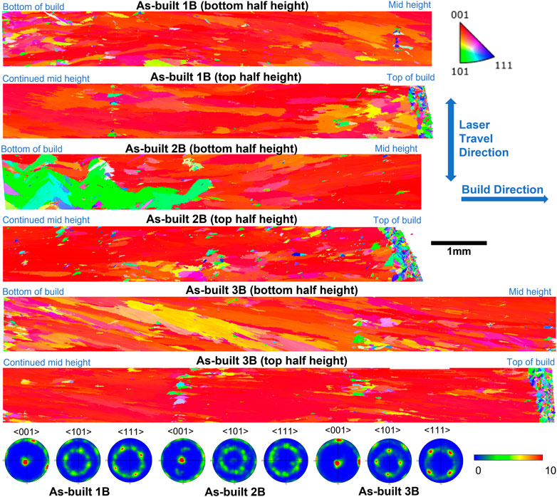 图4.反极图和沿构建方向的极图。反极图地图捕捉了制备好的横截面中每个样本的整个高度。为了更好地可视化,地图被分为两个区域(下半部分和上半部分)。