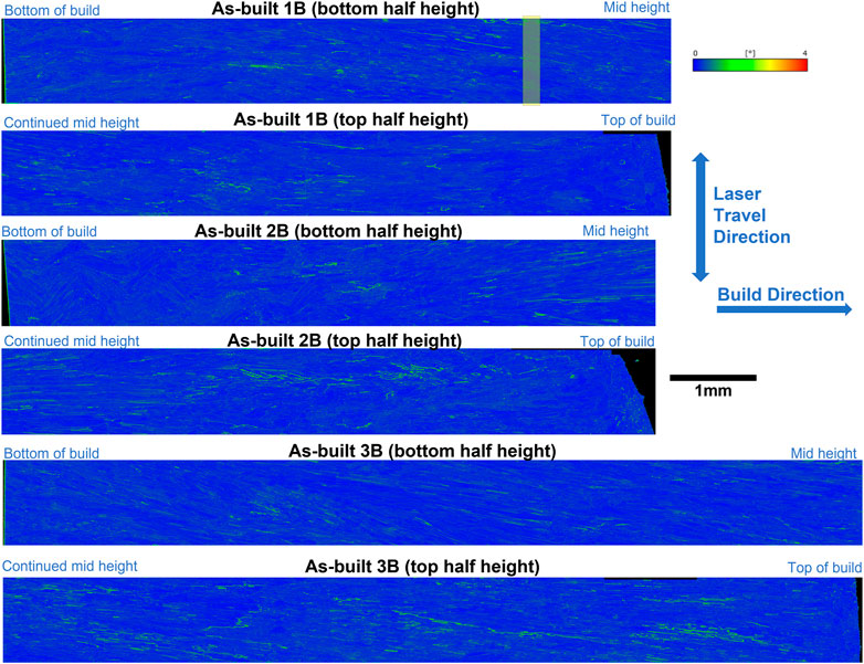 图 5. EBSD 内核平均取向误差(最大 4°)沿构建方向的已构建样品图。为了更好地显示,将图分为两个区域(下半部分和上半部分)。随后将数据平均化为薄片(1B 中黄色丝带所示),如图 6所示。