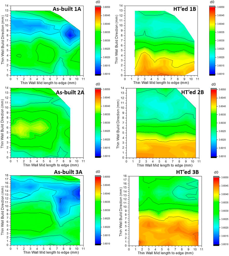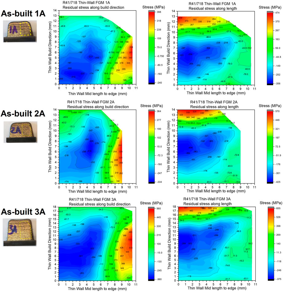 图 9.沿建造方向和长度方向的残余应力轮廓 1A、2A、3A。样本图片中的黄色虚线表示映射区域。