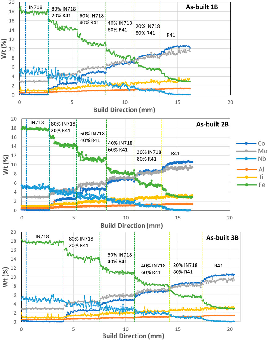图 7. EPMA 沿构建方向测量 1B、2B、3B 样品半成品中