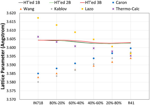 Petrushin,2008 年;Lazo 等人,2009 年)和带有 TCNI 数据库的 Thermo-Calc 预测的晶格参数的比较。