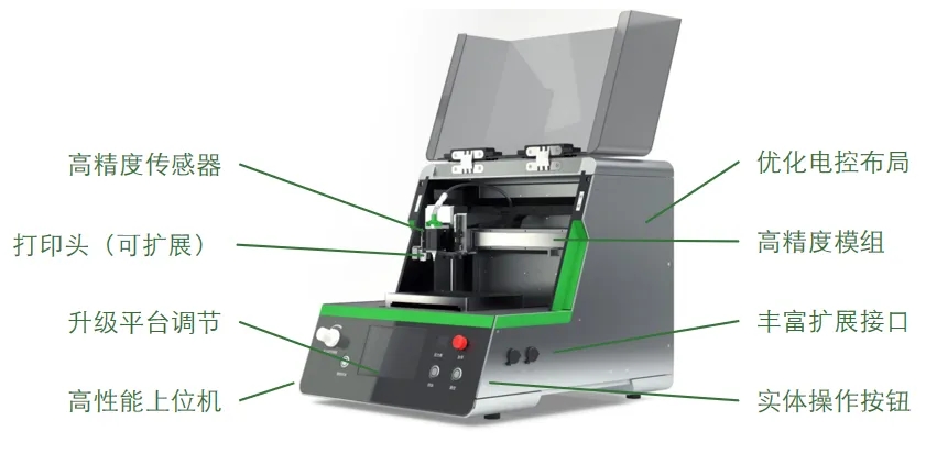 更高精度的模组:X轴和Y轴运动机构精度升级,可实现最高±5μm重复定位精度,在电极正负极表面构筑电解质层更精准,电芯一体化结构更紧密,并支持更高精度的微米级网格极片打印。