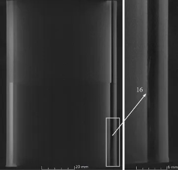 图6为含直径0.1mm线形多余物的第2088层X轴切片图像及检测效果,图像放大后可观察到线形多余物沿流道方向的影像。由于影像横跨多幅切片图像,线形多余物形态在该切片图像上不能完整呈现,且当金属丝紧贴内壁时,尺寸小的线形多余物检测困难,需要将多张切片图像进行对比和图像处理才能观察到。线形多余物测量值与标准丝径基本保持一致,绝对误差≤5μm,最小可测量线形多余物尺寸为0.1mm。