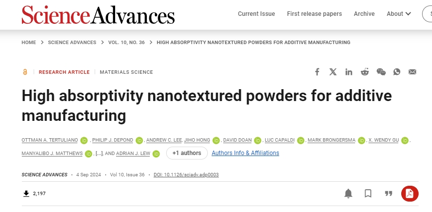 △该研究已发表在《Scientific Advisor 》期刊并荣登了9月份杂志封面,题目为“用于增材制造的高吸收率纳米纹理粉末”