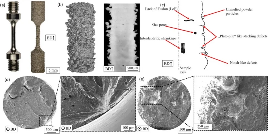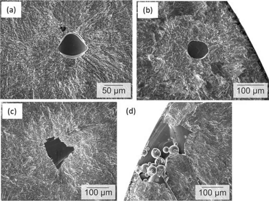 图4通过L-PBF制备的17-4 PH SS样品的断口图显示,在成型的样品中,裂纹是从a球形孔和b微缺口产生的