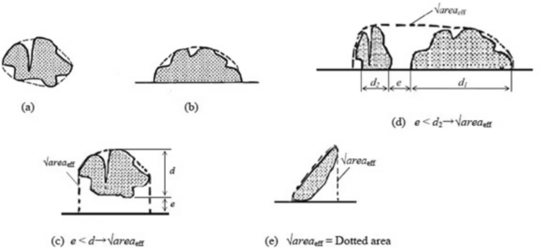 图6不同非圆形缺陷的有效尺寸,如a非圆形的内部缺陷、b非圆形的表面缺陷、c与表面相互作用的非圆形的内部缺陷、d与表面相互作用的两个相邻缺陷、e与表面接触的倾斜缺陷,用虚线表示