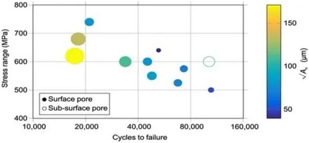 2.缺陷对HCF区域的影响更为明显。在这些缺陷中,熔融不足的影响更为不利,因为其形状不规则,会加剧应力集中。球形夹带气体孔隙由于其结构,应力集中的程度较轻。通常情况下,缺陷集中在表面附近,由于局部应力较大,这些缺陷对疲劳性能的影响更大。热等静压是减少缺陷(尤其是LOF空隙)数量和大小的有效方法。采用极值统计法可以估算出最大的预期缺陷及其与疲劳寿命的关系。