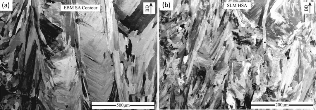 图8 a:E-PBF和b:L-PBF制备的合金718样品的显微组织特征的SEM图像