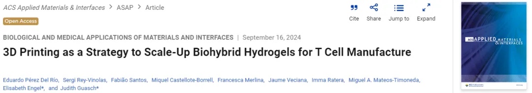 为了进一步推动其临床应用,来自西班牙巴塞罗那自治大学(UAB)材料研究所(ICMAB-CSIC)的Judith Guasch等团队评估了其可扩展性,并通过3D打印成功实现。因此,我们能够提高原始人类T细胞在生物混合PEG-肝素水凝胶中的浸润能力,同时增加营养、废物和气体的传输,从而在保持表型的同时提高了原始人类T细胞的增殖率。因此,本文向满足改进细胞免疫疗法中所用细胞产品制造的要求迈出了一步。相关工作以题为“3D Printing as a Strategy to Scale-Up Biohybrid Hydrogels for T Cell Manufacture”的文章发表在2024年09月16日的期刊《ACS Applied Materials & Interfaces》。
