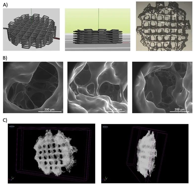 此外,扩散比也从1.68 ± 0.35(27G)增加到2.49 ± 0.41(25G),在两种情况下都是可以接受的,因为它们都在1到3之间。(33)此外,通过设计一个由十层组成的圆形网格结构,每层之间的线条间隔为1.5毫米,并以交替的方式垂直排列,对结构进行了修改(图5A)。这种新设计使我们能够将打印材料的数量增加10倍。为了进一步表征新设计,本文采用X射线微计算机断层扫描成像和环境扫描电子显微镜(SEM)来测量打印水凝胶的孔径和互连性(图5B, C)。正如图像所示,可以看到分层结构以及之前在大块水凝胶中观察到的水凝胶内部结构。