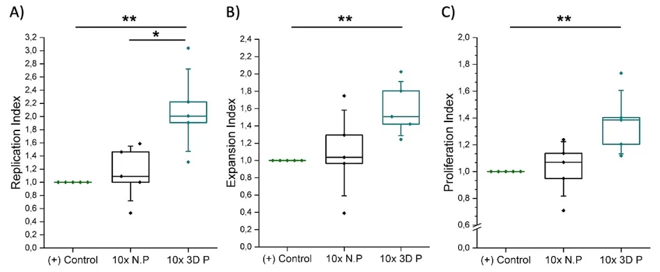 图6 在播种后6天,悬浮培养的初级人类CD4+ T细胞(阳性对照)、大块非打印PEG-肝素水凝胶(10x N.P)和大块3D打印PEG-肝素水凝胶(10x 3D P)的标准化增殖结果