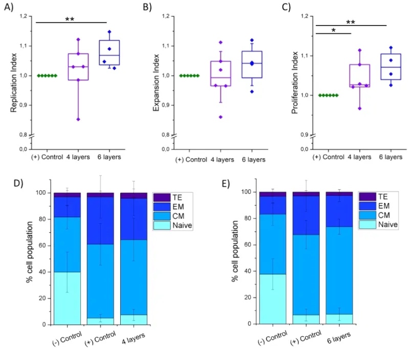 在下一步中,分析了两种类型的3D打印水凝胶在接种后5天产生的T细胞的表型。特别是,细胞被分类为初始型(TN;CD45RO-/CD62L+)、中心记忆型(TCM;CD45RO+/CD62L+)、效应型(TEFF;CD45RO-/CD62L-)和效应记忆型(TEM;CD45RO+/CD62L-)。对于四层水凝胶(图3D),观察到TCM表型的百分比显著增加,同时TEM减少。具体来说,四层打印水凝胶的TCM中位值为66%,阳性对照为61%,而阴性对照为45%。此外,打印支架的TEM平均值为23%,与阳性对照的30%和阴性对照的14%相比。最后,TN细胞从失活细胞的39%显著减少到悬浮培养或使用水凝胶培养的细胞的5%和6%,尽管激活细胞之间没有获得显著差异。尽管对于六层支架也观察到了类似的趋势,但观察到的差异不太明显,特别是对TCM表型而言(图3E)。