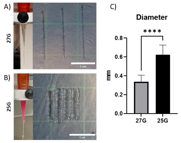 最近的研究已经证明,使用PEG-肝素水凝胶可以改善免疫细胞的培养效果,包括增殖和分化,这对于如ACT等细胞疗法来说是有趣的结果。然而,这些治疗需要培养体积可能达到升的量级,而目前的结果是在不到1毫升的体积下取得的。因此,有必要扩大水凝胶的尺寸以实现其临床应用。但是,支架尺寸的增加肯定会使细胞、营养物质和气体的传输更加困难。为了解决这个问题,本文研究了使用3D打印技术来扩大支架尺寸的方法。因此,本文选择了一个直径更大的针头(25G)并比较了其与之前的针头的可打印性。在这两种情况下,通过将预先形成的PEG-肝素水凝胶通过针头挤出并打印片段,获得了连续的纤维(图4A, B)。如本文所预期的那样,使用更大针头得到的纤维直径显著增加(图4C)。