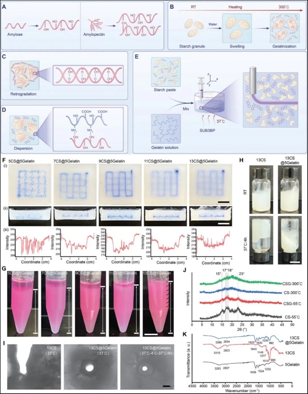 淀粉类水凝胶作为悬浮支撑浴的机制研究。A:淀粉组成,B:淀粉在水中加热后的凝胶化过程,C:凝胶化淀粉在冷却后的退火过程,D:引入明胶阻碍凝胶化淀粉的退火过程,E:淀粉类水凝胶悬浮支撑浴支持悬浮生物3D打印示意图,F:不同浓度淀粉类水凝胶可打印性,G:不同浓度淀粉类水凝胶离心后的淀粉颗粒体积,H:退火后的淀粉类水凝胶悬浮支撑浴倒置实验,I:退火后的淀粉类水凝胶悬浮支撑浴在不同条件下的打印结果,J:淀粉类水凝胶悬浮支撑浴XRD检测结果,K:淀粉类水凝胶悬浮支撑浴、淀粉和明胶FTIR检测结果
