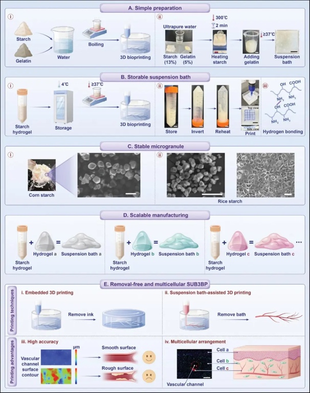 图1 无需去除悬浮支撑的4S生物3D打印方法。A:悬浮支撑浴制备过程简单,B:悬浮支撑浴可长期储存,C:悬浮支撑浴淀粉颗粒尺寸稳定,D:悬浮支撑浴可扩展,E:悬浮支撑浴可应用在多种打印场景及其高精度、多细胞制造功能