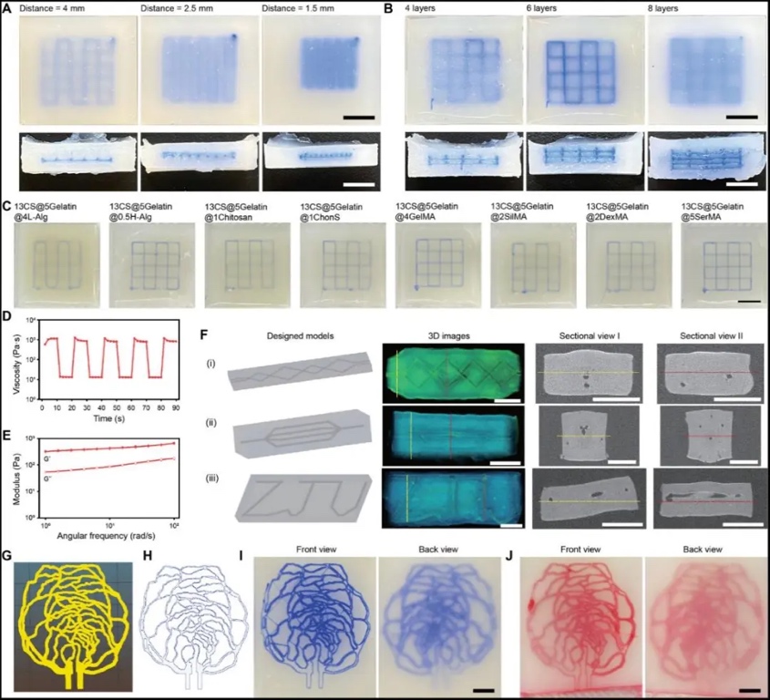 淀粉类水凝胶扩展悬浮支撑浴范围及工程血管网络制备。A:淀粉类水凝胶悬浮支撑浴内打印不同间距牺牲模板,B:淀粉类水凝胶悬浮支撑浴内打印不同层数牺牲模板,C:淀粉类水凝胶内引入不同水凝胶作为悬浮支撑浴,D&E:淀粉类水凝胶悬浮支撑浴流变测试,F:不同结构工程血管网络的制备,G:视网膜血管网络结构,H:视网膜血管网络打印路径规划,I:视网膜血管网络牺牲模板打印结果,J:视网膜血管网络贯通性测试结果