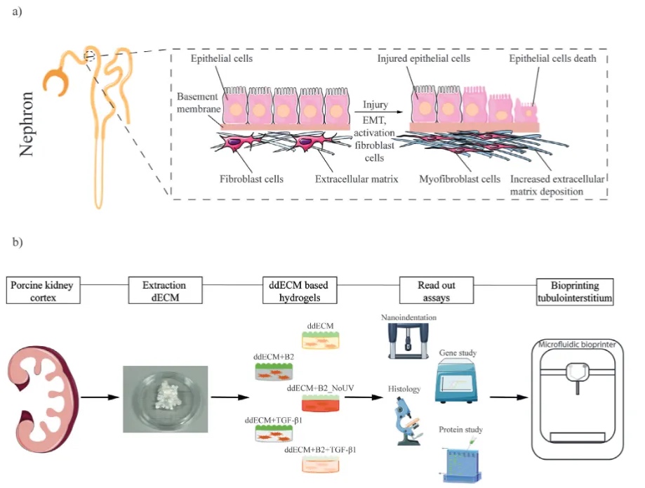 (1)建立了一个协议来对猪肾组织进行去细胞化处理,并使用ddECM来封装人类肾细胞。为了研究纤维化的进展,用转化生长因子β1(TGF-β1)处理细胞,并通过维生素B2交联调节ddECM水凝胶的机械特性。这种可灌注的生物打印模型复制了肾小管间质。