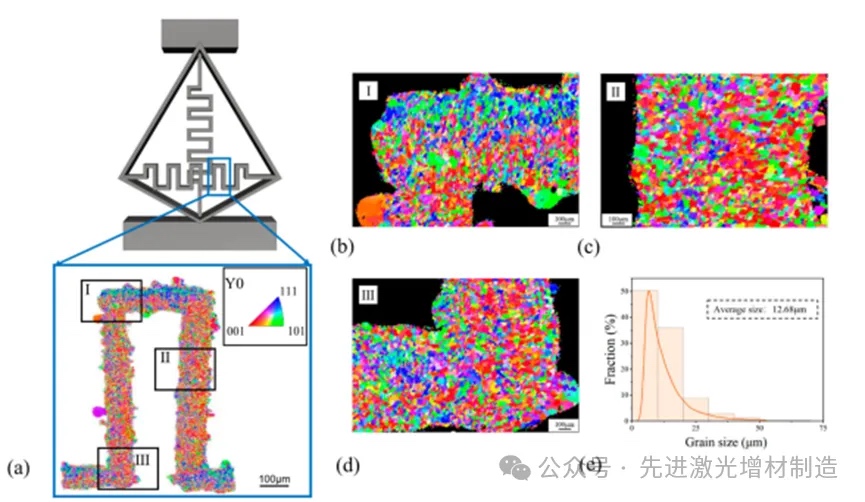 图5 从褶皱区选取三个具有代表性的区域进行EBSD分析:(a)褶皱标记处LPBF制备的QZS结构的EBSD图;(b-d)三个选定部分区域的放大视图;(e) QZS部分晶粒尺寸分布及平均值。