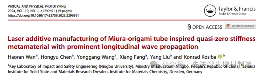 近期,宁波大学冲击与安全工程教育部重点实验室王永刚教授团队在《Virtual and Physical Prototyping》期刊上发表了以“Laser additive manufacturing of Miura-origami tube inspired quasi-zero stiffness metamaterial with prominent longitudinal wave propagation”为题的论文研究成果。本研究以三浦折纸管为灵感,利用激光粉末床熔合(LPBF)制备了一种具有复杂准零刚度(QZS)结构的新型超材料。QZS超材料单元由两层四边形框架和两个垂直弹簧组成,它们连接在对角线点上。研究了不同加工条件下QZS零件的几何精度、致密程度和力学性能,确定了优化的加工参数。采用实验和仿真相结合的方法,对QZS零件的位移响应进行了分析。结果表明,LPBF制备的QZS超材料在660 ~ 2500 Hz的低频范围内形成了4个超宽的纵波带隙。所提出的LPBF制备的QZS超材料在抑制工程结构纵向振动方面具有很大的潜力。